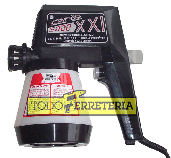 • El pulverizador eléctrico "CANE C5000", es una herramienta manual que se adapta tanto a la exigencia de los profesionales como a las sencillas necesidades del aficionado, ya que con el mismo se obtienen óptimos resultados por poseer este un sistema que le permite aspirar -exento de aire- todos los líquidos que puedan ser pulverizados y los proyecta por medio de su bomba inyectora, sobre las superficies