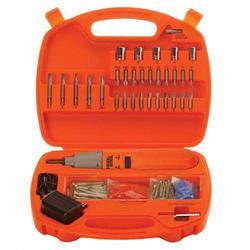 INCLUYE: CARGADOR, 30 PUNTAS PLANAS`-PHILIPS-HEXAGONALES-ESTRELLAS-CUADRADAS, 1 ADAPTADOR, 1 SOPORTE MAGNÉTICO PARA PUNTAS, 25 TARUGOS DE 5MM. CON TORNILLO, 25 TARUGOS DE 6MM. CON TORNILLO, MALETÍN