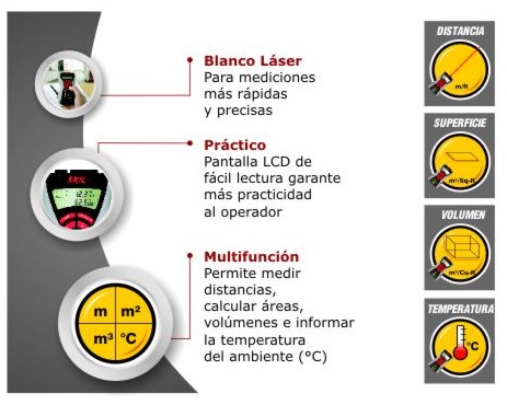 • Multifuncional: permite medir distancias (m), calcular áreas (m²) y volúmenes (m³) e informar la temperatura del ambiente (°C)