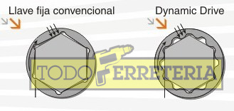• Perfil Dynamic Drive: proporciona un apoyo de esquina así como una sección de flanco adicional que transmite la torsión a la cabeza del tornillo o tuerca. Este contacto de flanco garantiza una máxima distribución de la carga y evita cualquier daño en la herramienta así como en la pieza