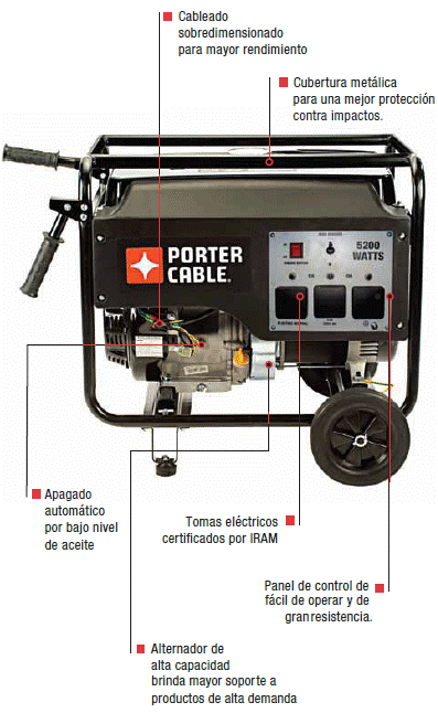• Porter Cable tiene una historia de muchos años en la construcción de generadores de alto rendimiento. Por muchos años Porter Cable ha dedicado sus esfuerzos para mejorar e incrementar la calidad e innovacion en nuestros productos. Porter Cable es una marca con una excelente reputación de calidad, rendimiento y servicio. La próxima vez que necesite un generador de calidad, busque los generadores Porter Cable proporcionando la confianza que Ud. necesita en su lugar de trabajo.