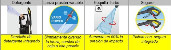 • Incluye: lanza Vario, lanza turbo, depósito para detergente, filtro de agua externo