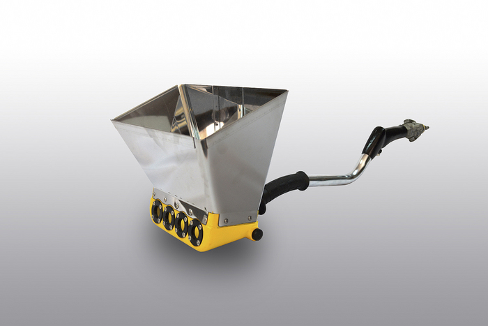 • Es una máquina que se utiliza como una pala, la cual tiene una tolva de acero inoxidable con una capacidad de un balde de albañil aproximadamente. En el otro extremo tiene un acople para manguera de 13MM, que puede tener una longitud de 25 metros, la cual la conecta a un compresor de aire. Este compresor puede ser de 3HP bicilïndrico, con correa baja-baja para lugares donde no tengamos trifásica, pero el ideal sería 5.5HP trifásico, en ambos casos con tanque de 180 litros, siempre hablamos de las mínimas dimensiones. La presión de trabajo para ésta revocadora es de 4.5 a 7BAR ( 65 a 100 libras ) y el consumo de aire, dependiendo del ritmo de trabajo, es de 300 a 350 litros por minuto.