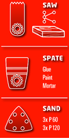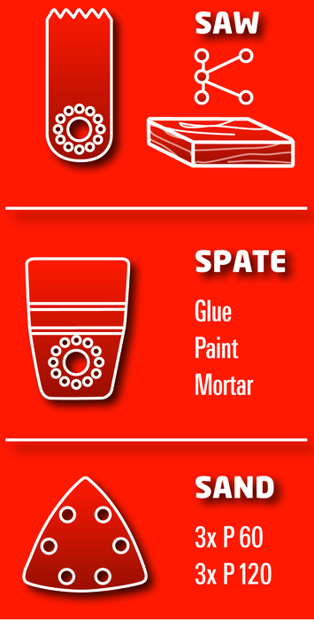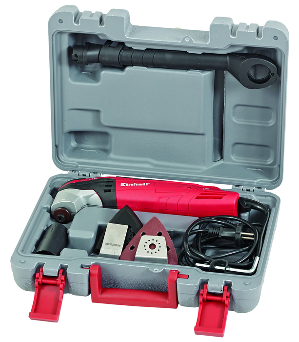 • Incluye: maletín plástico, llave allen, una sierra para madera y plástico, una sierra para metal y madera, una espátula, una base triangular para lijas delta, 3 lijas grano 60 y 3 lijas grano 120