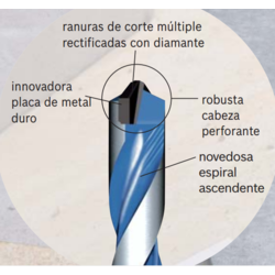 • Su elevada capacidad no es casual: innovadora placa de metal duro para usos múltiples. Ranuras de corte múltiple rectificadas con diamante para un elevado avance de perforación incluso en materiales duros como azulejos y cerámica. Robusta cabeza perforante para una prolongada vida útil. Nueva espiral inclinada para una óptima evacuación del polvo de perforación