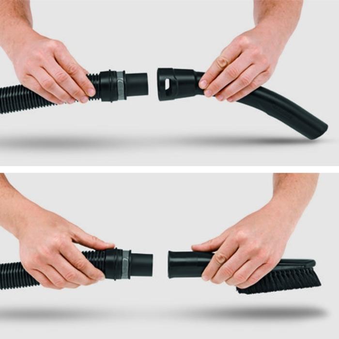 • El asa fácilmente desmontable permite que los accesorios puedan montarse de forma directa en la manguera de aspiración