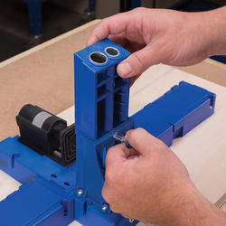Funciona insertándolo en su Kreg® Jig K5, K4. Simplemente colóquelo en el lugar del bloque de guía de broca normal. Eso le permite sujetar el material con el que va a fabricar sus tarugos en su lugar y perforar de la misma manera que se utiliza para crear agujeros de bolsillo o agujeros Kreg®. La broca de corte se adapta a cualquier taladro.
