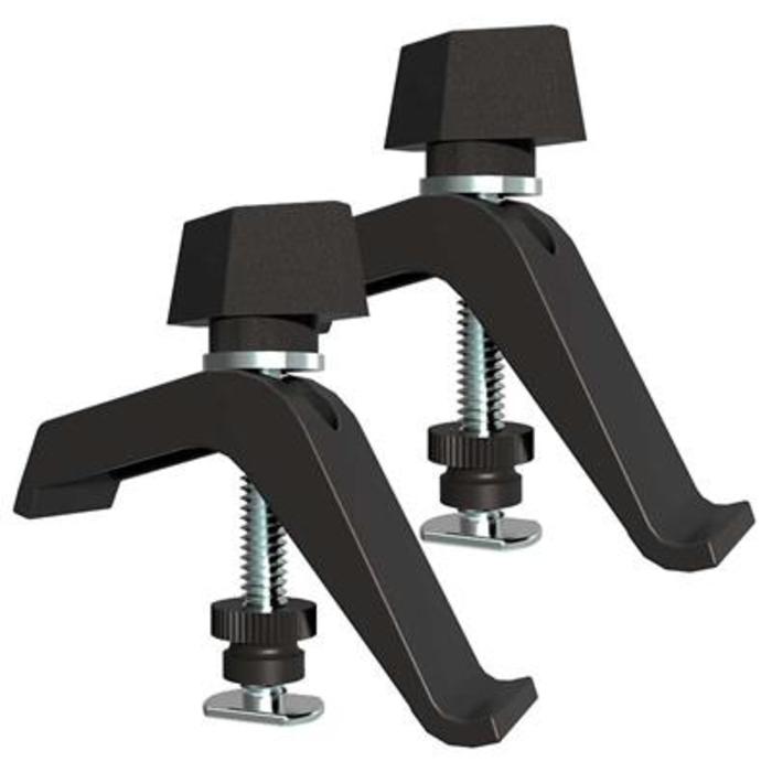 Estas  abrazaderas  son el acompañante perfecto del sistema de guía  de sierras circulares Accu-Cut. Se fijan  en la parte inferior de la guía Accu-Cut y el bloque de inicio para ofrecer una potencia de retención adicional cuando sea necesario, como cuando se trabaja con láminas de superficie resbaladiza como tableros de partículas recubiertos de melamina o al cortar con una sola longitud de pista