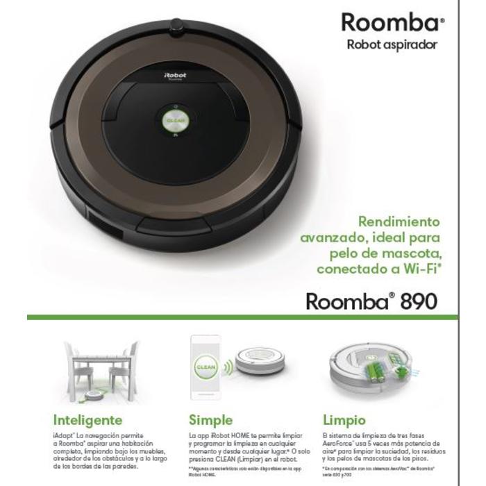 La aspiradora iRobot Roomba 890 conectada a WiFi utiliza un sistema de limpieza de tres fases AeroForce, donde brinda hasta 5 veces más potencia de aire para un mejor rendimiento de limpieza en alfombras y pisos duros, los cepillos para superficies múltiples dobles extraen residuos sin enredos, el cepillo para barrido de bordes elimina desechos a lo largo de los bordes de las paredes y esquinas