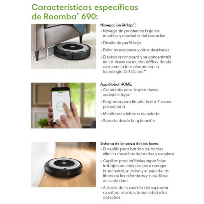 • La aspiradora iRobot Roomba 690 conectada a Wifi utiliza un sistema patentado de limpieza de 3 etapas con cepillos dobles multisuperficie, un cepillo de bordes especialmente diseñado y aspiración de vacío para limpiar todo, desde partículas pequeñas hasta restos grandes de sus pisos