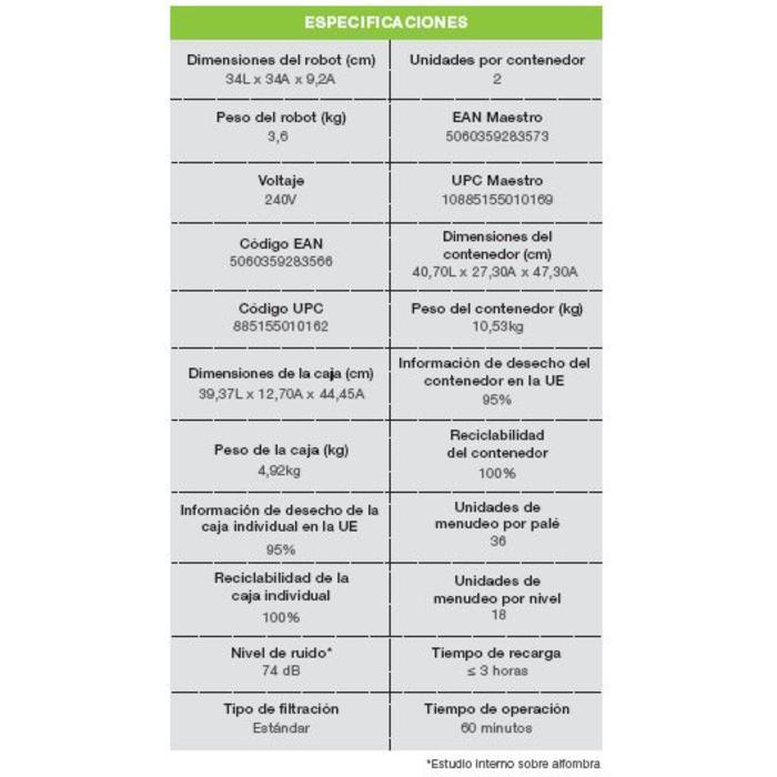 • Dimensiones del robot (cm): 34L x 34A x 9,2A