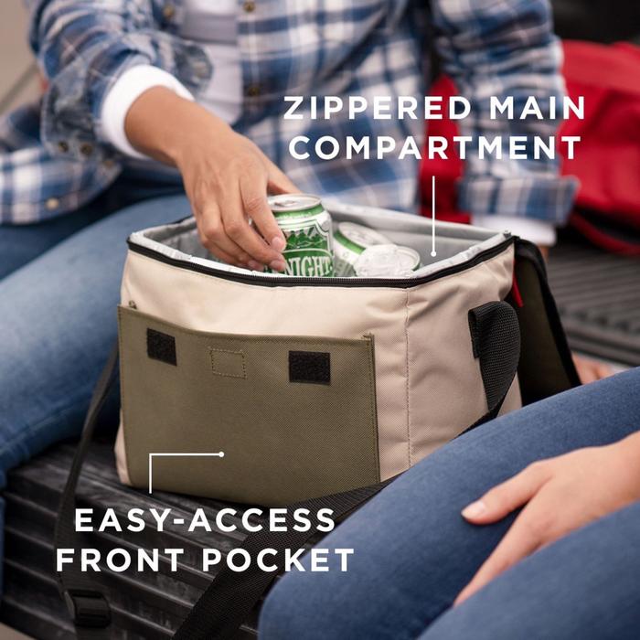 • El compartimento principal con cremallera se ajusta hasta 18 latas, y sella en frío con un aislamiento de primera calidad, manteniendo el hielo por hasta 20 horas en temperaturas de hasta 30°C