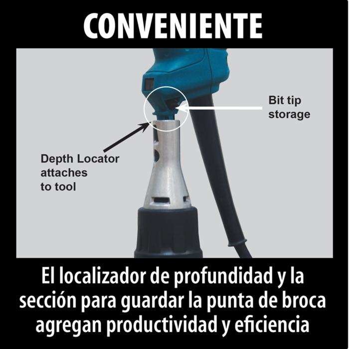 • Tope de profundidad de una sola pieza, ajustable a rosca, y fácilmente extraíble para trabajos vistos, con tope de goma en la punta para evitar holguras en el prolongador