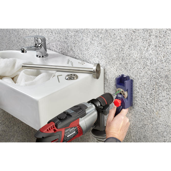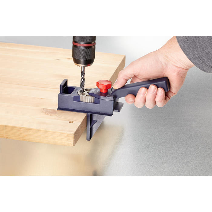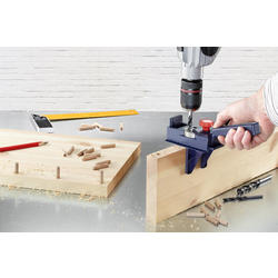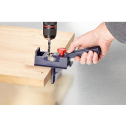• Guía para espigas DÜBELPROFI, juego completo, con espigas de madera, de diámetro 6-8-10MM y mechas en espiral para madera CV de diámetro 6-8-10MM, con tope paralelo y posicionador de perforaciones, para uniones en esquina, angulares, en "T" y uniones en superficies, seguro de goma antideslizante para superficies lisas y delicadas, para todas las espigas habituales de diámetro 6-8-10MM, también adecuado como guía para perforaciones exactas de 90° de 3-12MM