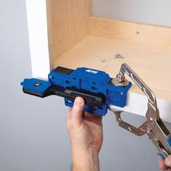 • La plantilla cuenta con un brazo de soporte que lo ayuda a sostener la puerta con una mano, mientras que la otra mano queda libre para montar las bisagras en el gabinete