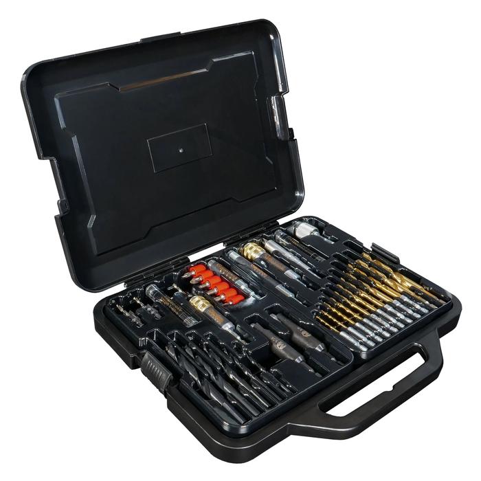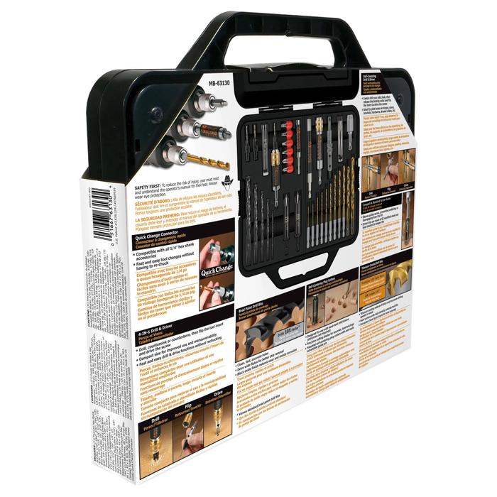 • 11 Brocas de vástago hexagonal recubiertas de titanio: 1/16", 5/64", 3/32", 7/64", 1/8", 5/32", 3/16 ", 7/32", 1/4", 5/16", 3/8"