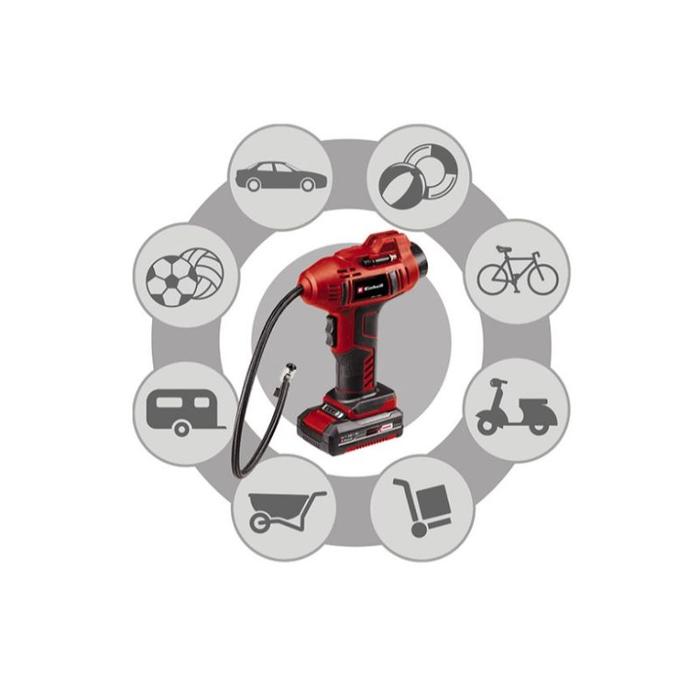 • Con el compresor de aire inalámbrico para automóvil Einhell CE-CC 18 Li-Solo, las tareas más pequeñas, como inflar neumáticos de automóviles, neumáticos de bicicletas o pelotas, son un juego de niños