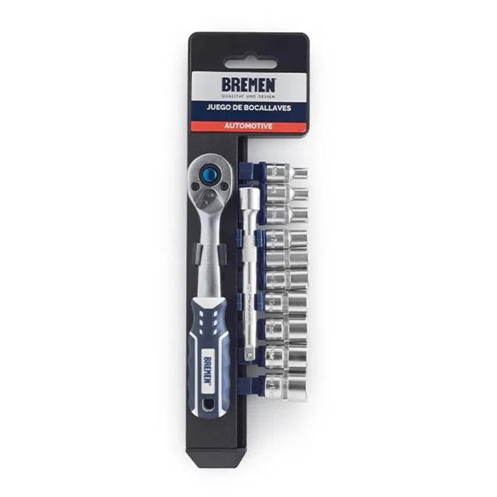 • El juego de bocallaves con accesorios portátil Bremen es una herramienta completa que cuenta con 12 piezas de cromo vanadio, de las cuales incluye 10 bocallaves de distintas medidas milimétricas, 1 barra de extensión y 1 llave crique