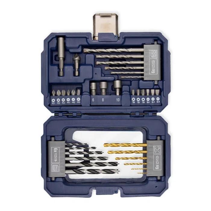 • Incluye un variado portfolio de puntas y vasos en acero al CR-V con encastre hexagonal de 1/4", y tambien diferentes accesorios necesarios para aplicaciones de agujereado y fijación en general
