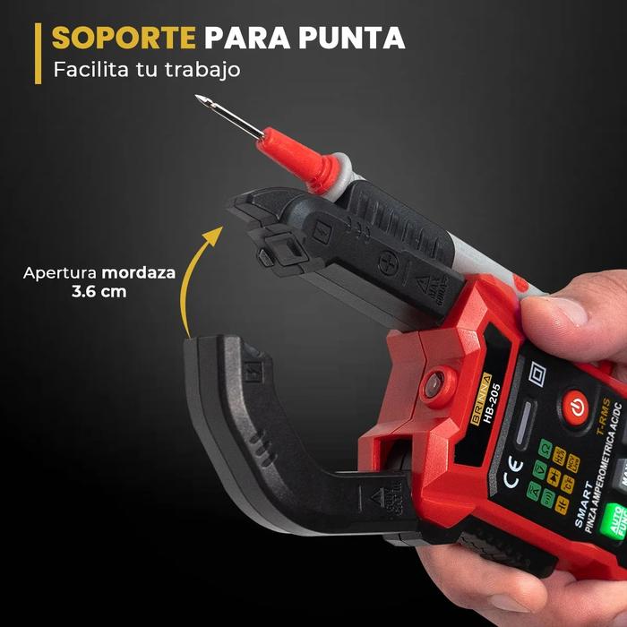 • Pinza amperométrica digital profesional True RMS con Pantalla y funcionalidad SMART, medición de Corriente Continua, Capacimetro y múltiples funciones extra, ideal para transportar y de alta resistencia mecánica