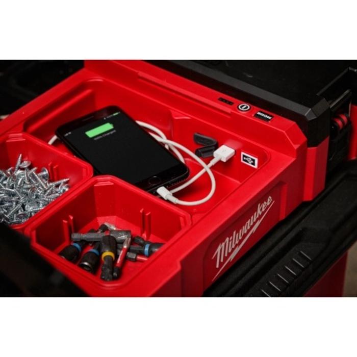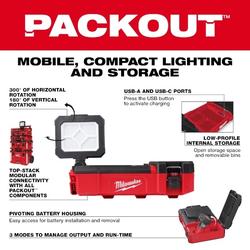 • Nuestro reflector M12 con carga USB y compatibilidad con PACKOUT le permite cargar dispositivos con los puertos USB-A y USB-C de 2.1 A y guardar pequeños artículos en el compartimento