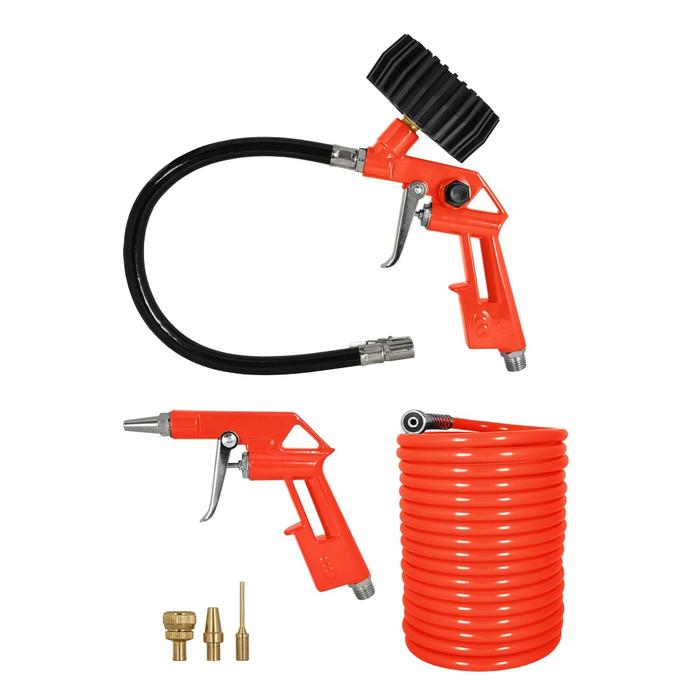 • Accesorios Incluidos: Pistola para sopletear, Manguera en espiral, Pistola para inflar con manómetro, Picos para inflado