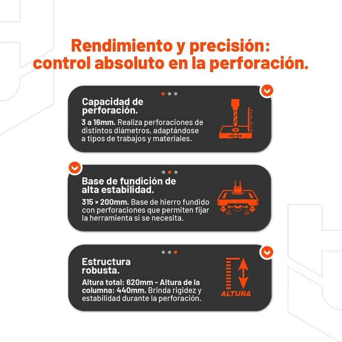 • Su arquitectura con columna de 46MM y mesa ajustable conforma una base estable para perforaciones perpendiculares precisas
